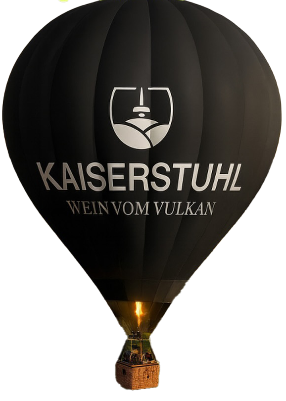 Der elegante schwarze Heißluftballon ist in Zusammenarbeit zwischen dem Ballonteam Dägele und der Kaiserstühler Weinmarketing GmbH entstanden und bringt die Weinregion auf eine ganz neue Weise in die Luft.